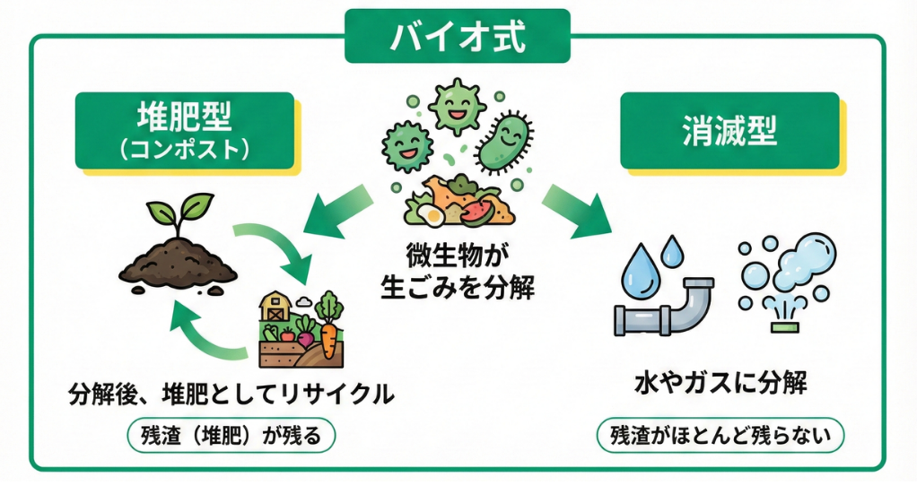 バイオ式とは、微生物が生ごみを分解するタイプの処理機です。このバイオ式には「堆肥型」と「消滅型」があります。