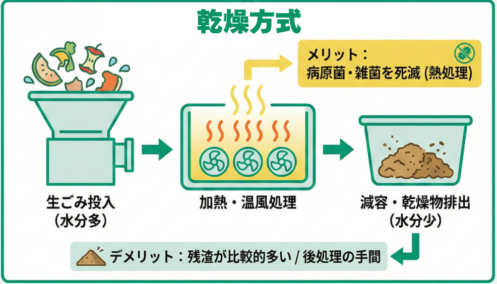 熱や温風を生ごみに当てて水分を蒸発させ、生ごみの量を減らす仕組みが「乾燥方式」です。この方式の場合、熱を加えることによって病原菌や雑菌を死滅させられる点がメリットです。ただし、バイオ式と比較すると残渣が多く残るため、後処理に手間がかかるといった面もあります。