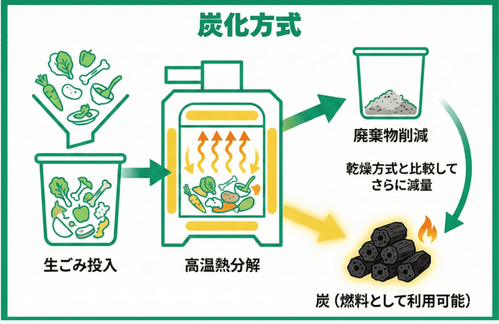 生ごみを高温で熱分解して処理するものを「炭化方式」といいます。こちらの方式の場合、乾燥方式と比較すると廃棄物の量を減らせる点に加え、炭を燃料として使用できます。